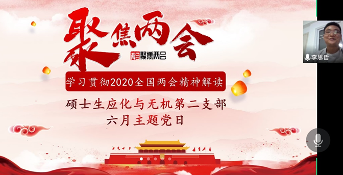 2020年6月29日晚,硕士生应化与无机第二党支部通过腾讯会议功能开展了6月份主题党日活动,党支部13位党员同志均积极参与,支部书记李思哲同志主持会议。会议主要聚焦在学习2020年全国“两会”精神,讨论相关学习心得以及讲解6月份时事等。