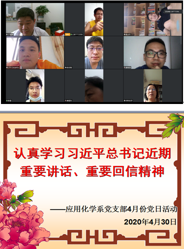 4月30日,应用化学系党支部通过腾讯会议开展了线上4月份主题党日活动。会议由支部书记黄健涵同志主持,支部全体党员同志参与。