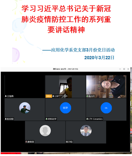 2020年3月24日,应用化学系党支部通过腾讯会议开展线上3月份主题党日活动,议题是学习习近平总书记关于新冠肺炎疫情防控工作的系列重要讲话精神。支部书记黄健涵同志主持会议,支部全体党员参加。
