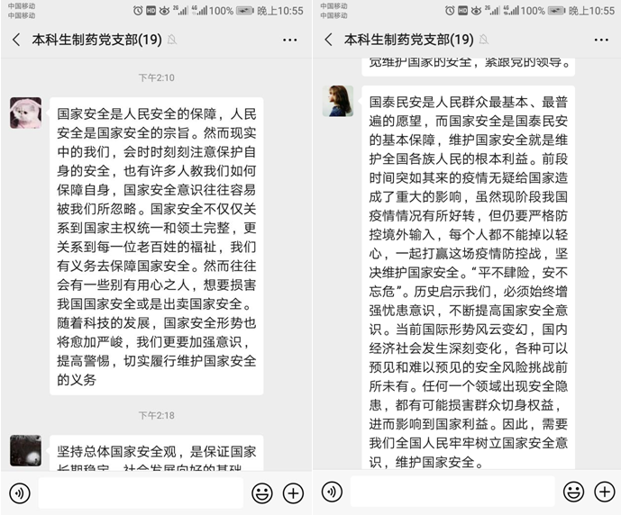 为加强对新时代国家安全工作新要求的学习,加深对总体国家安全观的认识,本科生制药党支部于2020年4月26日下午召开关于“总体国家安全观”主题学习党日活动,支部全体同志参与活动。由于疫情影响,本次活动以线上会议的形式进行。