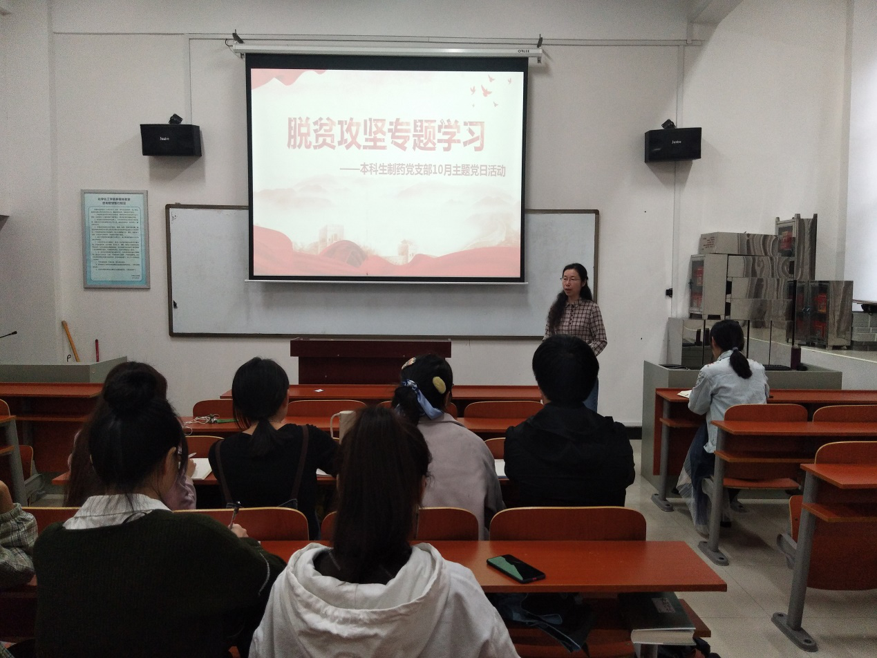 2020年10月14日10时,在化学楼123教室,制药系党支部书记钟王艳为本科生制药党支部全体党员讲授主题教育专题党课,带领大家共同学习党中央脱贫攻坚方针政策和习近平总书记脱贫攻坚重要战略思想。