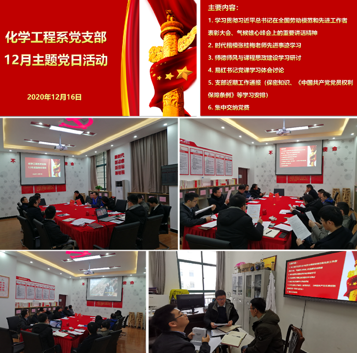 2020年12月16日下午,化学工程系党支部在化学楼132党员活动室举行12月份主题党日活动。会议由支部书记韩凯同志主持,支部全体党员参加。