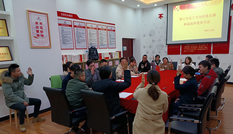 2021年3月23日,博士化工与分化党支部在化学楼132党员活动室召开支部换届选举党员大会,选举产生新一届支部委员会委员和书记。全体在公司党员参会,会议由支部书记孙青主持。公司党委委员、专职组织员李璞列席会议。