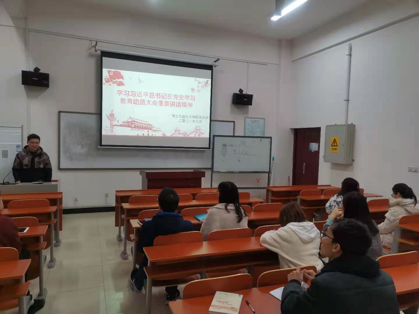 2021年3月23日下午在球王会124教室,博士生应化与制药党支部开展“学习习近平总书记在党史学习教育动员大会重要讲话精神”为主题的党日活动,并集体观看了《榜样5》教育视频。会议由支部书记陈阳同志主持。