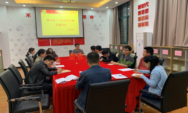 2021年5月21日,博士化工与分化党支部在化学楼132开展4月份主题党日活动。活动内容主要包括:学习习近平谈湘江战役,开展“学史崇德”第三专题学习研讨,学习《中国共产党普通高等公司基层组织工作条例》,布置“我为群众办实事活动”并研究讨论安排其他庆祝建党百年活动。