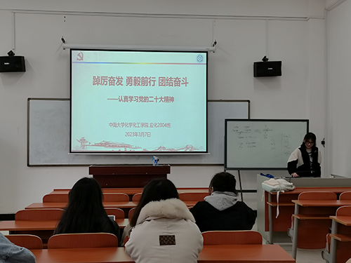 2023年3月7日上午10点,应化2004班全体同学在班长郭慧萍的带领下于化工楼125教室开展“踔厉奋发勇毅前行团结奋斗——认真学习党的二十大精神”主题班会。本次会议主要介绍了党的二十大主题及报告内容、全面建设社会主义现代化国家的重大任务、目前党和国家所面临的重要风险和挑战。