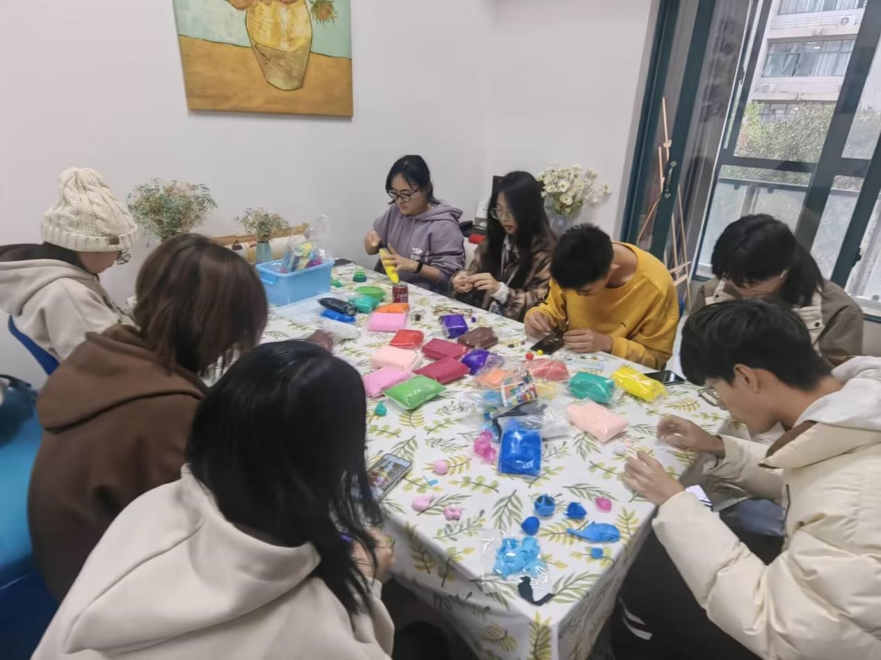 本次活动由心助会陈雨青、李雨桐主持,8位同学组成体验小组,共同参与活动。经过小小的热身活动,“愈捏愈乐”活动正式开始,大家全身心沉浸于黏土创作世界,思绪在想象中放飞,压力在创作中释放。创作完成后,大家在欣赏黏土作品的同时分享生活、交流经验、友谊悄然升温。