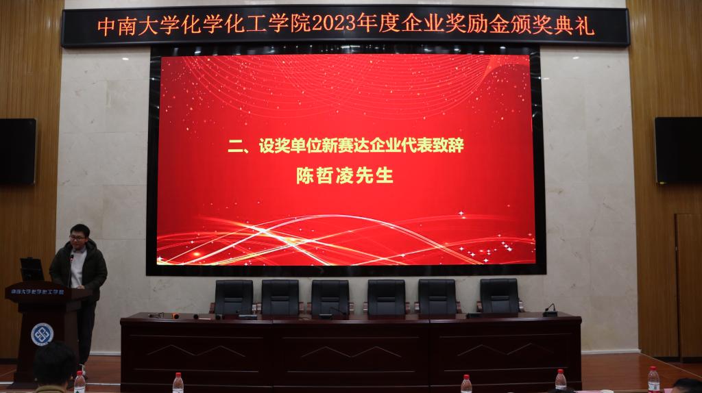 首先,陈哲凌先生致开场辞。他先向大家介绍新赛达的由来,讲述它是由几位85级应用化学专业的学长所建立,同时表示企业重视对优秀员工和困难员工的资助工作,并希望化院学子秉承前辈们的优秀品质,继承前辈们的赤子之心,积极进取的姿态全力报效祖国,担负起新时代赋予的责任和使命。