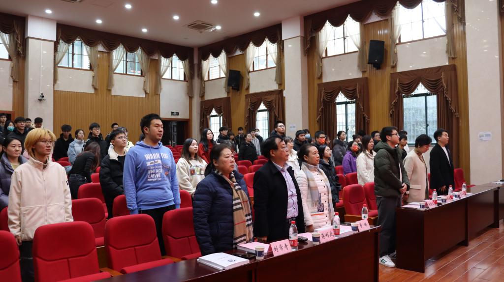 下午四点三十分,颁奖典礼正式开始,全体师生起立奏唱国歌。