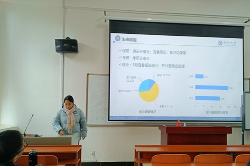 随后,陈铭展示了班级同学的意向调查问卷结果,大多数同学准备考研,而准备直接就业的同学占比最少。虽然同学们的选择不尽相同,但都对自己的未来有了比较清晰的规划。